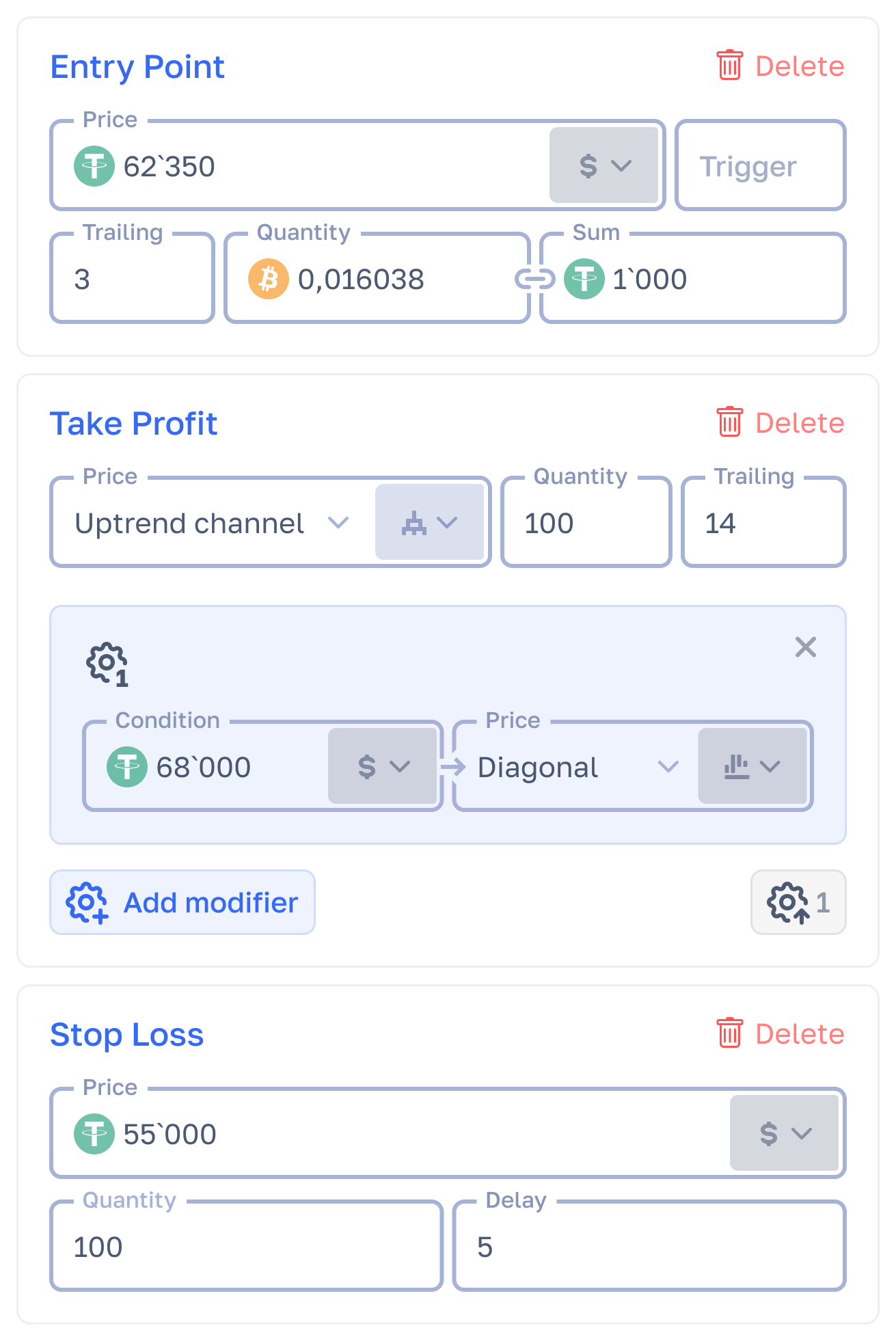 Trailing available for entry and exit points. Timeout and Stop Loss triggers, hidden orders and many other functions.